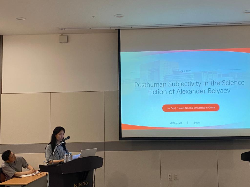 刘子琪为公司比较文学与世界文学专业博士生,作为受邀代表参与了分论坛“Misreading the East”(误读东方)第一场,并做学术报告“On Posthuman Subjectivity in Belyaev”(《论别利亚耶夫科幻小说中的后人类主体性》)。该英文演讲基于刘子琪主持的公司研究生科研创新项目“论别利亚耶夫科幻小说中的现代性反思”,将后人类主人公的技术具身视作主体性的一种极端追求,面对后人类的身份认同危机,认为或死或消的悲剧结局是主体性在存在论层面遭遇的终极悖论,并在后人类理论的视域下提出以游牧和共生的路径来重建技术时代的主体性。