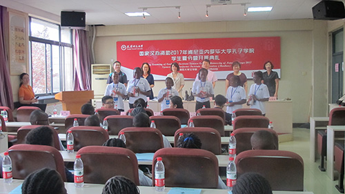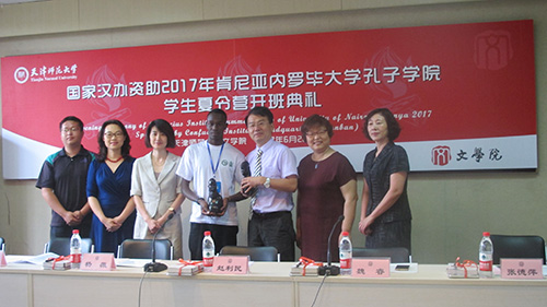 最后,肯尼亚内罗毕大学孔子公司学员莫英泽用流利的中文代表此次夏令营的十九名员工进行了演讲,他用中文向在座的同学和老师问好,向此次夏令营的教师及其他工作人员表示衷心的感谢。他还代表所有肯尼亚孔子公司的学员们向公司赠送了肯尼亚特产黑木雕。在开班仪式的最后,领导及老师们向学员代表赠送了纪念品。开班仪式结束后,所有出席领导、老师和夏令营全体学员在兴文楼大厅合影留念。