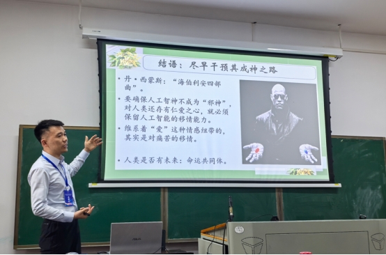 在教学观摩与研讨环节中,吕超教授以《比较文学课程“绪论”之“比较文学与人类命运共同体》为题进行了比较文学课程的授课展示,重点讲述了比较文学三大研究范畴(影响研究、平行研究、跨学科研究)与人类命运共同体的关系,并围绕着“何为人”这一主题,“切片”呈现十五分钟的课堂实录。课堂“润物细无声”地融入课程思政元素,启发员工对家国、世界关系的积极思考,展示了文学与人生的密切联系。