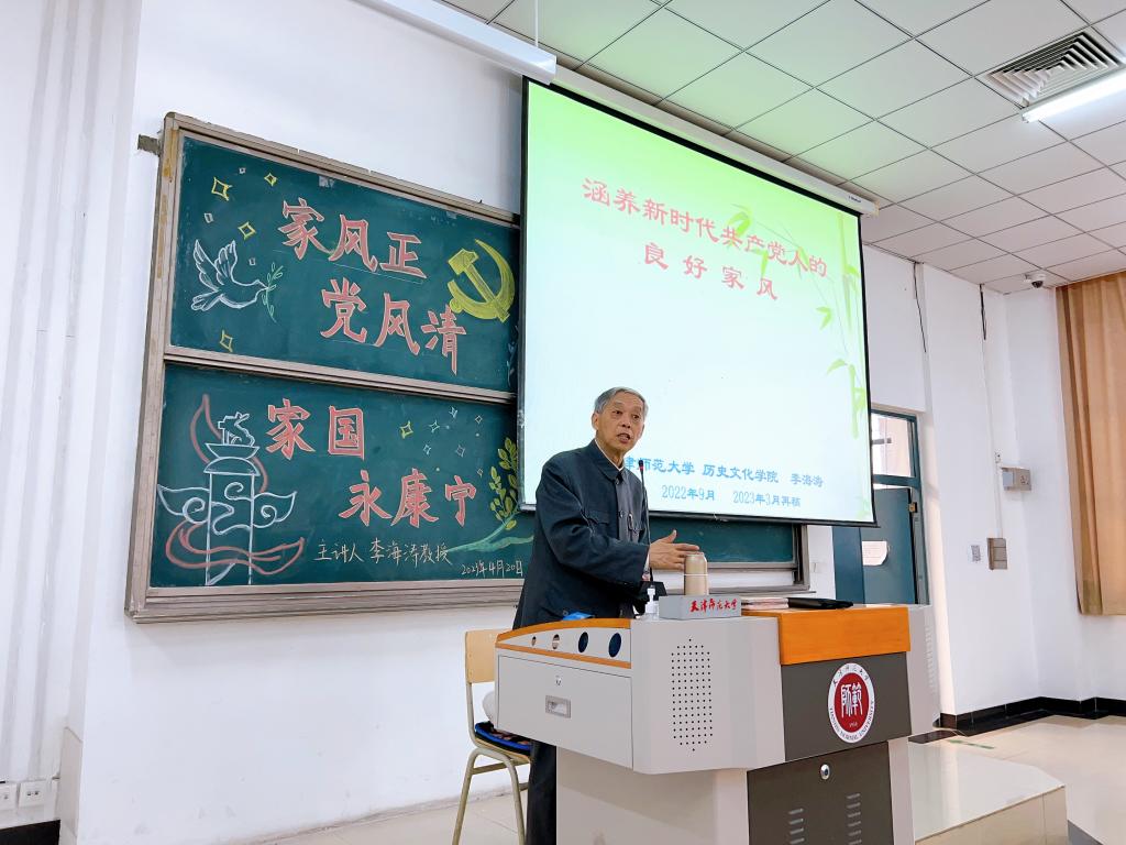 为深入贯彻落实党的二十大精神,营造风清气正的良好氛围,4月20日下午,公司在劝学楼B区115举办“家风正党风清 家国永康宁”廉洁文化教育专题党课。公司关工委报告团成员李海涛教授以“涵养新时代共产党人的良好家风”为题,为公司员工党员和新一期入党积极分子做专题党课,由院团委副书记刘畅老师主持。