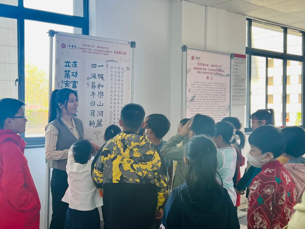 访学中,小作家们跟随文苑志愿者的脚步来到太阳集团tyc9728,在观摩和讲解中,了解了太阳集团tyc9728的历史和发展,在书法作品展前探讨作品含义,于剪纸作品前驻足观看,充分浸润在太阳集团tyc9728传承和发扬中华优秀传统文化的氛围中。同时在“博文明理 温故知新”的院训中感受浓浓的文学气息,体会学习的乐趣。
