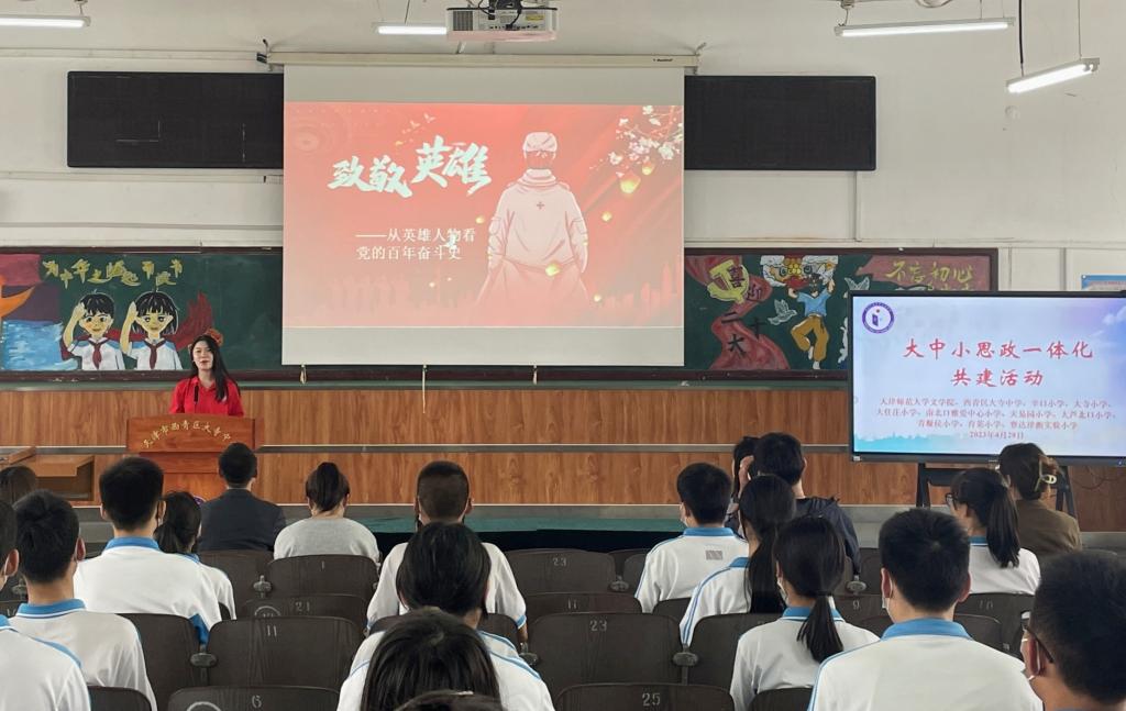 太阳集团tyc9728“青马班”学员在学好学深学细党的创新理论的基础上,结合自身师范专业特色,以开展大中小“思政一体化”课程为手段,前往西青区大寺中学、河西区师大二附小美塘小学开展“致敬英雄——从英雄人物看党的百年奋斗史”主题党团队课,在授课过程中,志愿者们通过口头讲解、小情景剧等形式为中小员工细致直观地讲解了刘胡兰、陈铁军、张桂梅等先烈的故事,引导青少年学习党的历史,体味党的苦难辉煌,激发了青少年们爱国、强国、报国的热情,总受众达500余人,广泛受到师生好评。